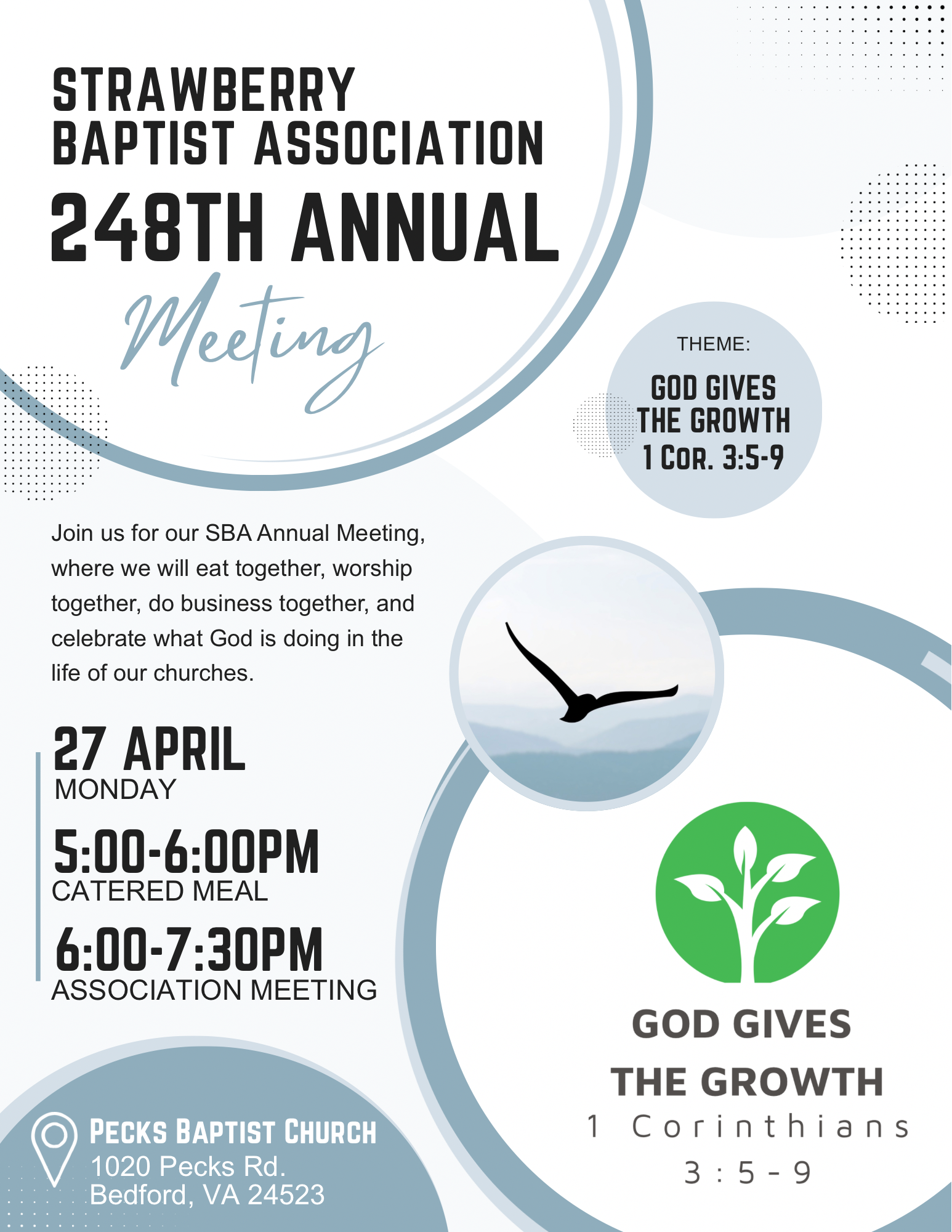 Welcome to the Strawberry Baptist Association, a cooperative body of 22 Southern Baptist congregations ministering in Bedford County, Virginia and the surrounding area. This site is designed to help you know who we are as an Association and what we are doing. Thank you for visiting our site. We hope that you will find the info you are looking for and how you can be involved the Strawberry Baptist Association family of churches.